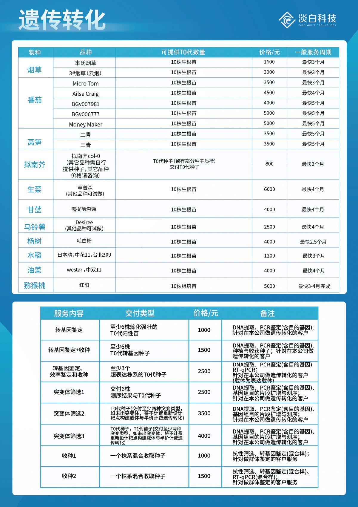 本氏烟1600元/基因 拟南芥800元/基因 技术团队每年5000次基因转化,实验成功率极高,多种抗性可选(kana、hyg、basta)用户自主选择,服务全国100多家单位,500多个课题组,在线更新实验进度,用户可随时查看。