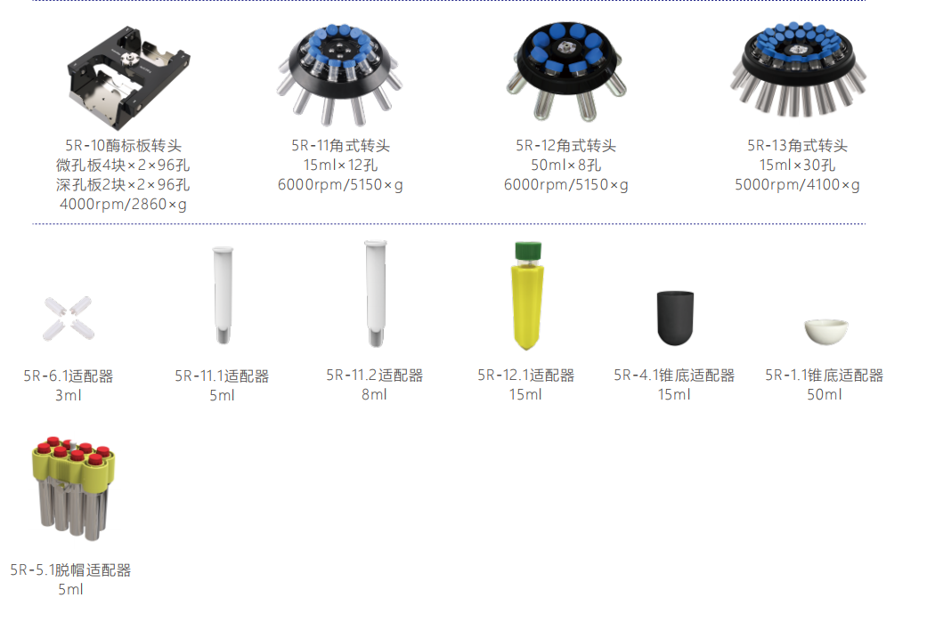 广泛的转头和适配器选择,适用于所有常用的离心管;