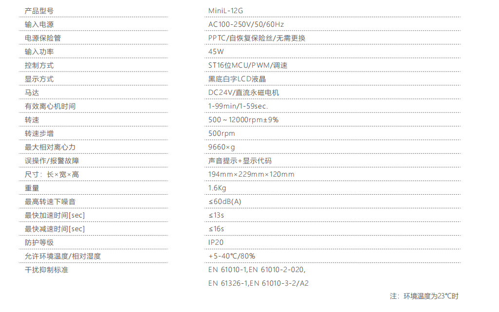 离心转速步增调节为500rpm,有效离心时间范围: 1-99分钟或1-59秒;