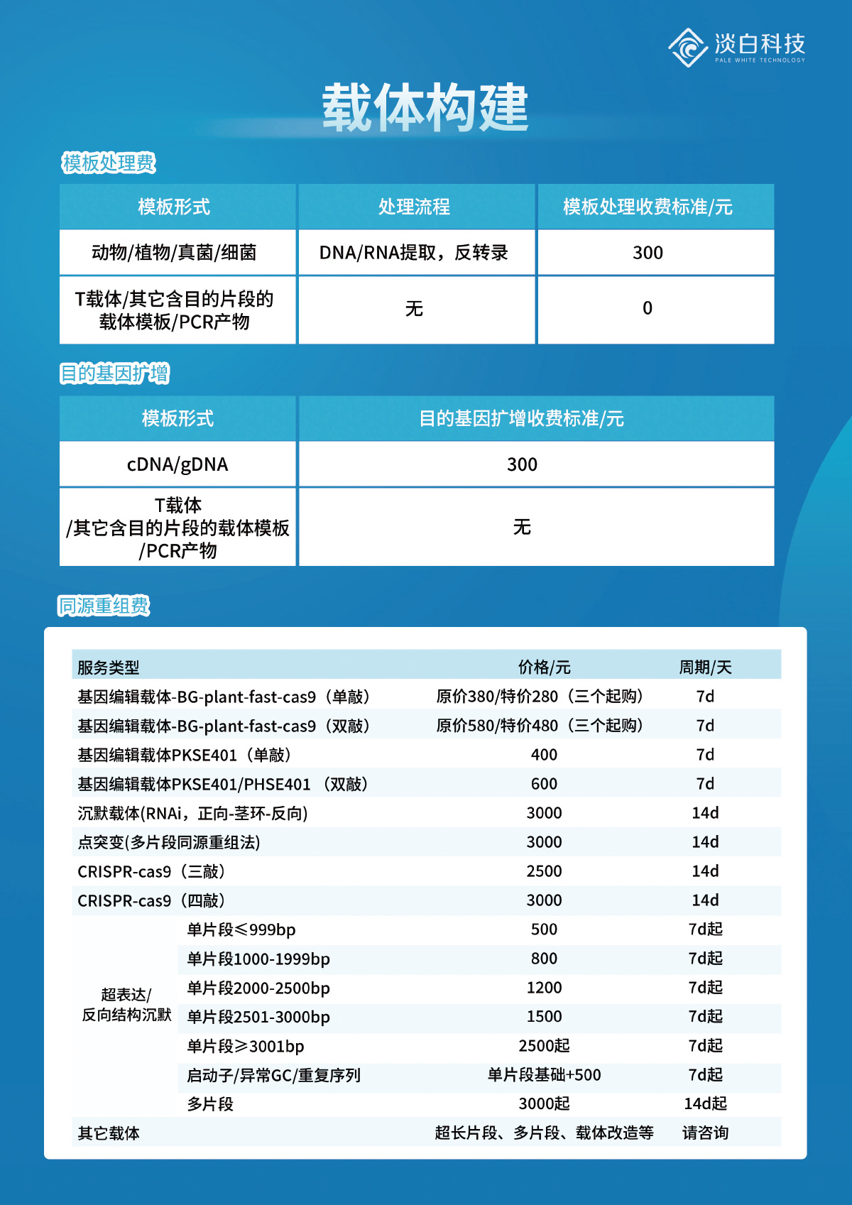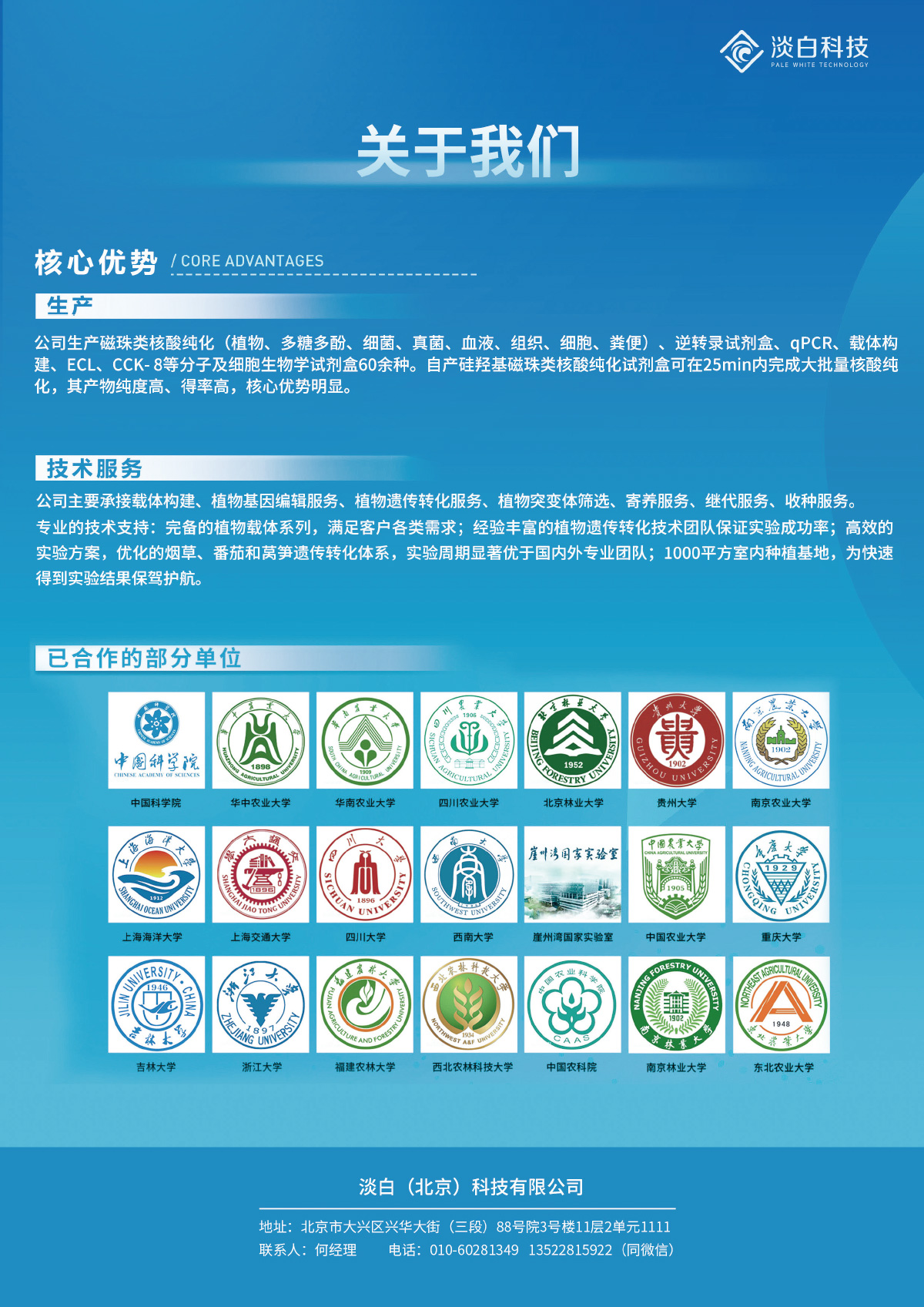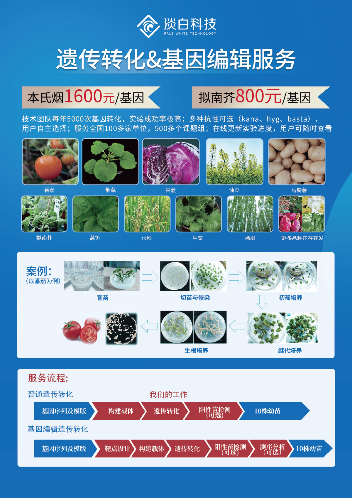 本氏烟1600元/基因 拟南芥800元/基因 技术团队每年5000次基因转化,实验成功率极高,多种抗性可选(kana、hyg、basta)用户自主选择,服务全国100多家单位,500多个课题组,在线更新实验进度,用户可随时查看。